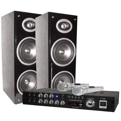 Set completo per il Karaoke plug and play. La facilità di utilizzo di questo set ti permetterà di divertirti con i tuoi amici diventando una star. Due bellissime casse a colonna in legno nero da 200w. Due microfoni e un amplificatore con diverse funzionalità. Lettore USB, SD, bluetooth, contollo dei volumi, bassi e alti ed effetti integrati. Un set completo per divertirsi in compagnia con una qualità audio professionale.