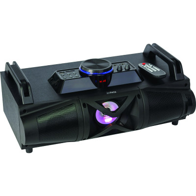 Compact portable speaker, with DJ control panel on top. Two MIC inputs, Bluetooth connection, USB and SD port. The LED lights will make the right atmosphere for your best time.