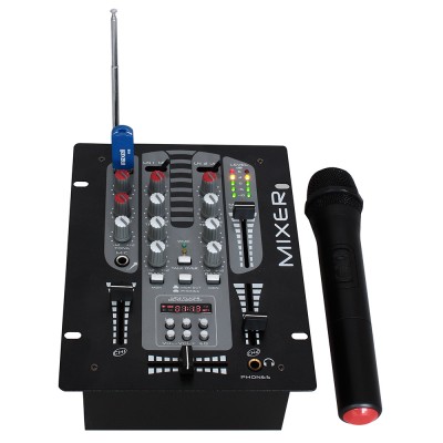 Mixer da DJ versatile ricco di funzionalità, dotato di lettore USB-MP3-Bluetooth, ingresso per microfono, radiomicrofono palmare VHF e uscita monitor extra.