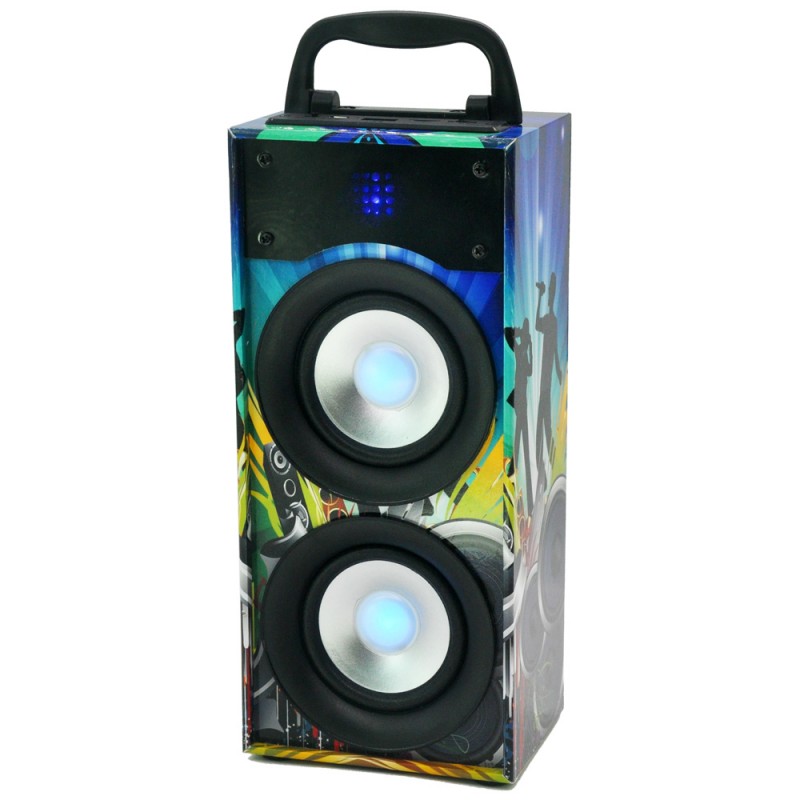 Enjoy the new look of Party-Disco2 in addition to its big potential: connect your devices via Bluetooth, AUX and USB, turn on its radio and the LED lights around the woofers. Wherever you go take this cool speaker with you thanks to the rechargeable battery and make the party truly unforgettable!