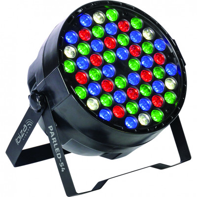 Ce puissant projecteur PAR à LED est équipé de 54 LED de 0,75 W (12 rouges, 18 vertes, 18 bleues, 6 blanches) couplées à des lentilles indépendantes de 25°. Il peut fonctionner en modalité automatique, activé par le son ou via DMX (8 canaux). Le double étrier intégré permet de suspendre le projecteur ou de l’installer de manière autonome au sol.