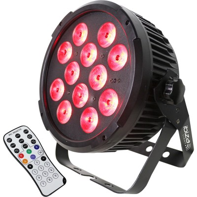 Flat-profile LED PAR with 12 x 12 W RGBWA-UV 6-in-1 LEDs. Can be operated in automatic mode, sound-activated, or controlLED using the included remote control or via 4 or 10 DMX channels. The integrated double yoke allows for suspended or easy stand-alone floor deployment.