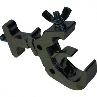 Gancio da palco a forma di G in alluminio con sistema di fissaggio rapido per proiettori di luce ed effetti sospesi in sicurezza. Per tubi da 48-52 mm. Carico massimo 150 Kg. Colore nero.